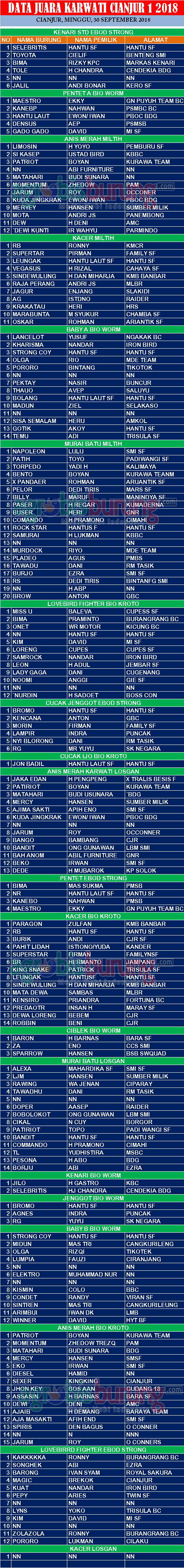 Gelaran Spesial Piala Karwati Cup 2018 di Cianjur pada Minggu (30/09) lalu menjadipembuktian bahwa kicau dan kekek mania di Cianjur penuh semangat untuk meramaikannya. Menempati area halaman DPRD Cianjur, kicau dan kekek mania saling memberikan dukungan terbaik buat jago jagonya, di penghujung lomba perebutan juara umum BC akhirnya diraih Rony Burangrang Bandung yang mengumpukan poin terbanyak. Disusul Hansu SF yang mraih kemenanga sebagai juara umum SF.