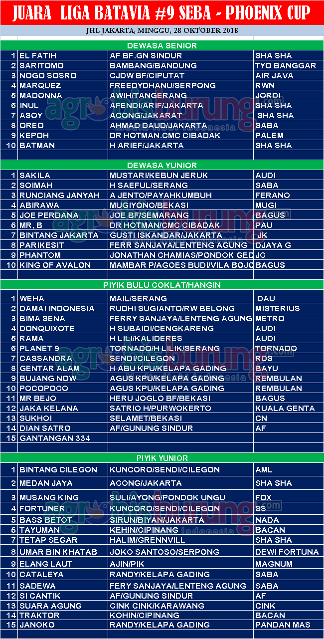 Di dewasa yunior Sakila milik Mustari RCTI lagi lagi mengemas kemenangan hebatnya setelah tampil joss di JHL Sakila mampu memperbaiki posisinya di klasemen sementara Liga Batavia 2018. Di Kelas piyik Yunior, Weha milik Mail Serang yang juga tampil joss langsung melenggang manis dipuncak juara dan disusul oleh Bintang Cilegon milik Kuncoro/Sendy yang memenangi pertarungan di kelas piyik hanging.