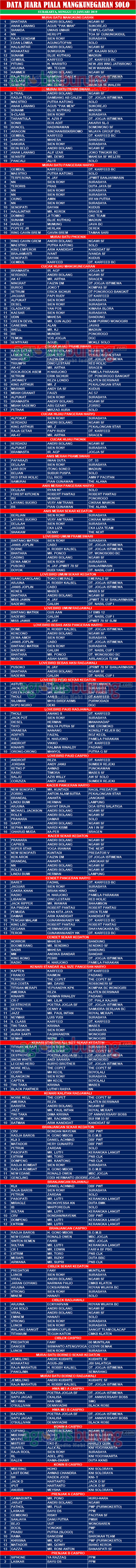 Headline Hobi Burung Juara Kicauan Kicauan Organizer Data Juara Lengkap Piala Sri Paduka mangkunegaran Surakarta, Minggu (13/01) agrobisburung 14 Januari 2019 Partai neraka di kelas murai batu Tinggalkan Komentar Post navigation Previous: Havana Angkat Topi untuk Basa Basi , Basmalah joss, Rama & Pusaka Banten Kuasai piyik di Liga Batavia & Hut Phoenix di TMIINext: Rebut Runner-Up di TMII, Innova Debutan Anyar Padma BF Cimahi Tampil Menjanjikan More Stories Headline Perkutut Profil Carpenter BF Mataram NTB, Kembangkan 50 Kandang Unggulan Dengan Trah Jawara agrobisburung 16 Desember 2025 Headline Perkutut Profil Satu Lagi Big Bos Asal NTB Bakal Ramaikan Perkutut Nasional 2026, Samuel BLT Arrowhead Siap Berkolaborasi HDL – Carpenter Dengan Amunisi Istimewa agrobisburung 15 Desember 2025 Headline Organizer Perkutut Hasil Rakerwil Jawa Tengah 2025 : Lanjutkan LLBJ Sebanyak 10 Putaran, Meramaikan Daerah dengan program Liga Piyik di Masing Masing Pengda agrobisburung 15 Desember 2025