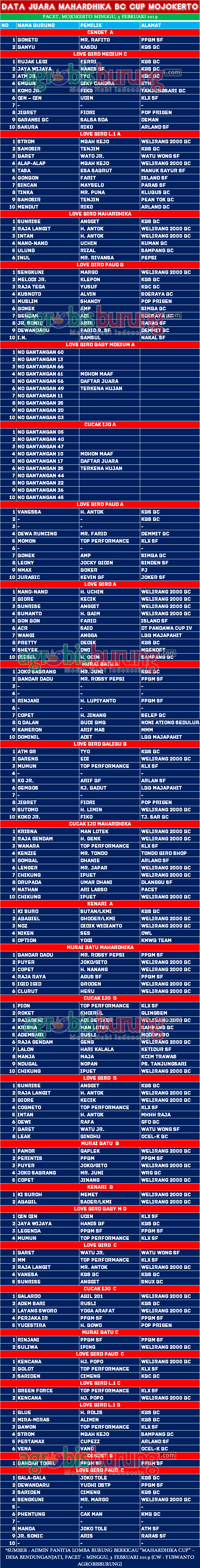 “Event ini sebagai lounching gantangan Mahardhika BC. Saya bersyukur lombanya sukses. Setidaknya tercatat ada 916 peserta dari 32 kelas yang dijadwalkan. Terima kasih atas kehadiran dan kepedulian kicau mania Mojokerto dan Prigen. Atas nama panitia saya juga mohon maaf bila masih banyak kekurangan,” ujar Bang Heri selaku Ketua Pelaksana.