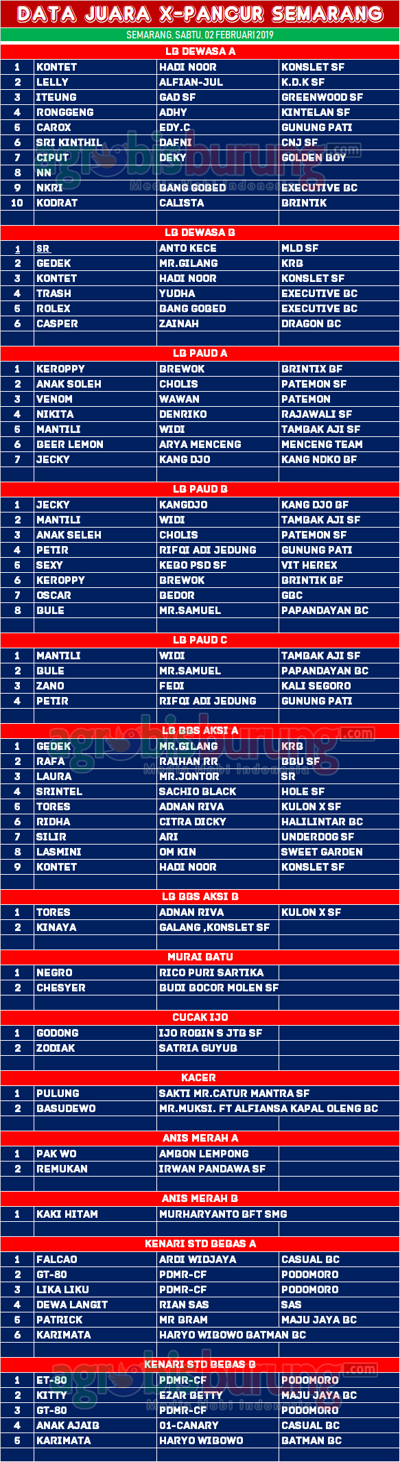 Dikelas kenari yang sengaja di buka 3 kelas penyisihan dan satu kelas final tanpa di pungut biaya pendaftaran dan tentunya masih mendapat hadiah. Di kelas kenari Tim Maju Jaya dengan andalan kenari Kitty dan ET 80 kenari dari team Podomoro mengacak ngacak posisi daftar juara. Di sesi murai batu Negro polesan Mr Rico naik tahta dengan merebut juara A mutlak tanpa dapat di susul lawan lawanya.