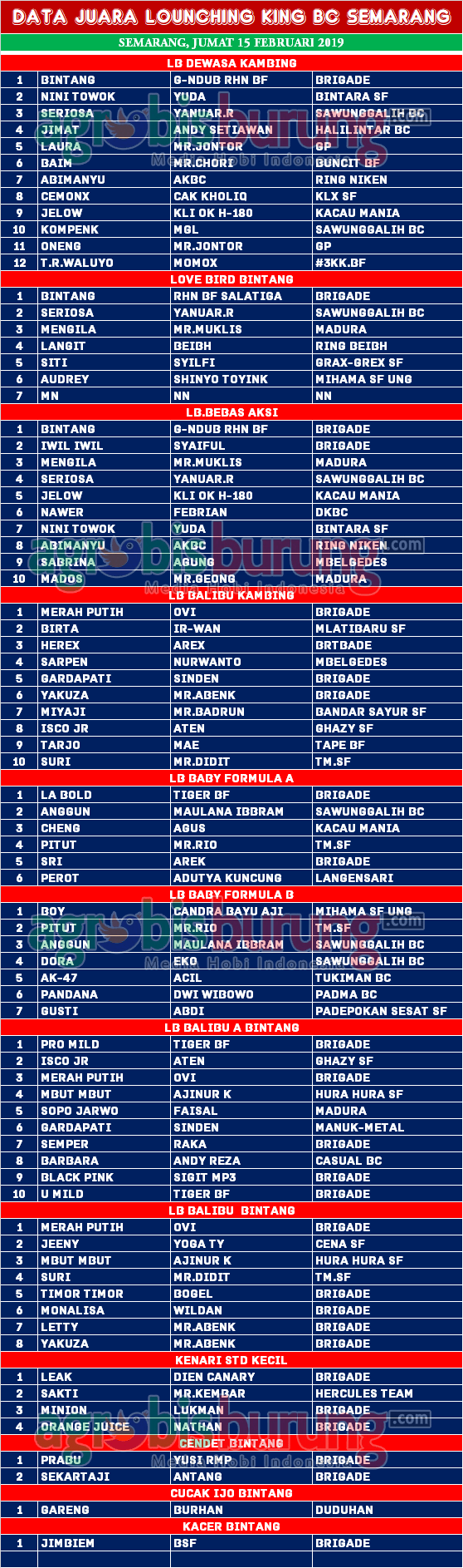 Salah satunya bintang debutan baru Mr Gendub RHN BF Salatiga yang berhasil menyabet podium tertinggi di semua kelas love bird dewasa, tampil ciamik di setiap sesinya. Dengan gaya full fighter dan durasi yg aduhai membuat point’ yang di kumpulkanya tak bisa di susul lawan lawanya. Di kelas Balibu yang memperebutkan hadiah seekor kambing menjadi milik love bird Merah Putih milik Brigade SF juga menunjukkan eksistensinya gaya ngekek panjang dengan jeda nafas yang singkat. Merah Putih membuat si perawatnya bahagia dengan meraih point’ tertinggi dan membawa pulang seekor kambing.