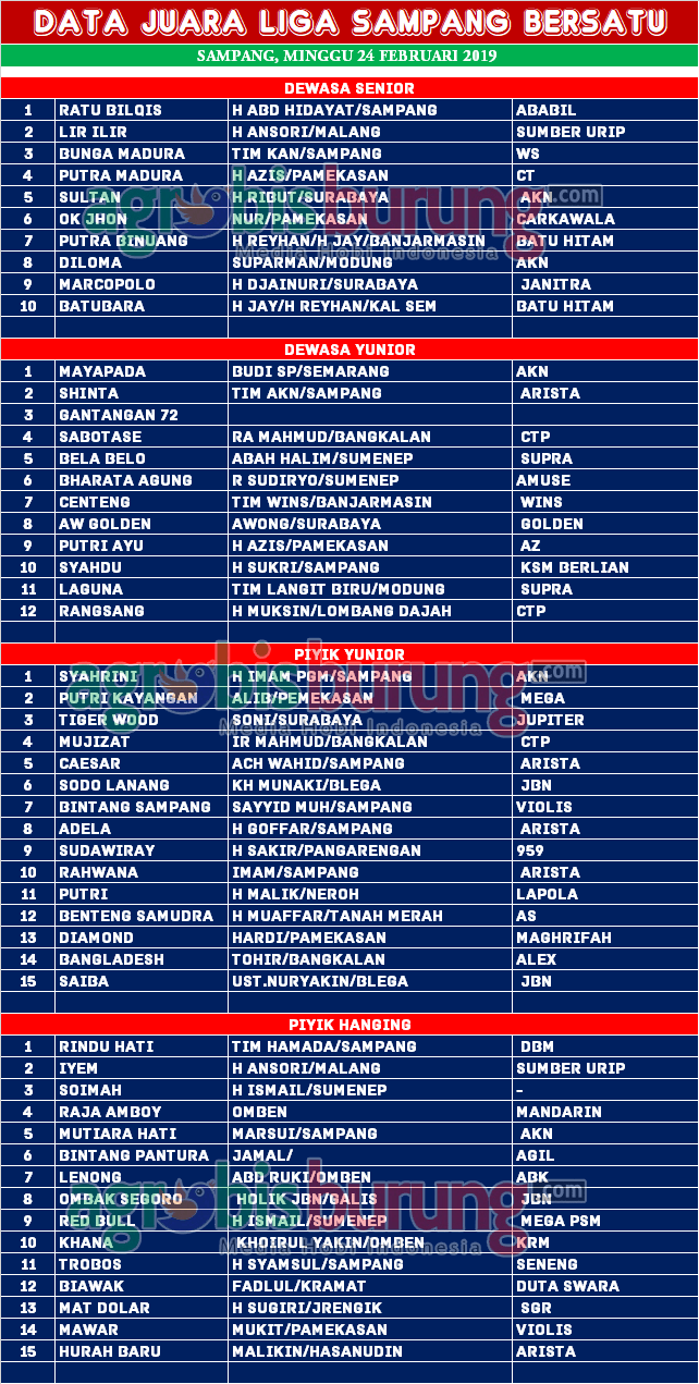 Di kelas dewasa yunior, Mayapada bergelang AKN milik Budi SP menjadi yang terbaik, kemenangan Mayapada menjadi modal utama untuk ikut tour the LPI Purworejo pada akhir pekan depan. Di kelas piyik yunior muncul Syahrini sebegai jawara anyar milik H Imam PGM, kemenangan Syahrini juga kembali mengukuhkan produk AKN tetap eksis muncul di puncak kejuaraan.