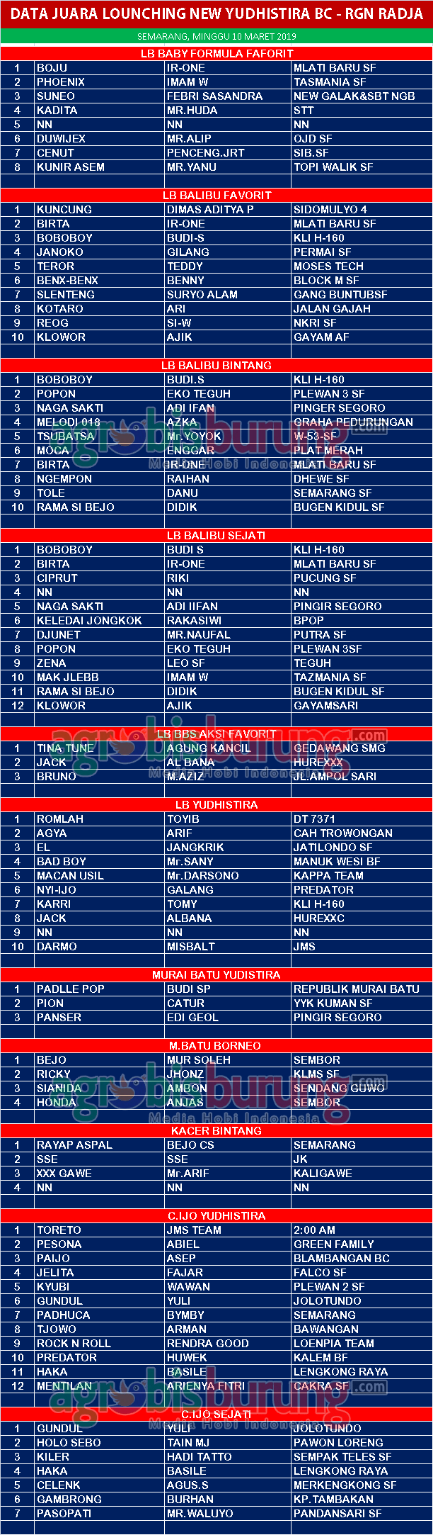 AGROBISBURUNG.COM – SEMARANG. Satu lagi gebrakan yang sangat signifikan Di kota Semarang, tepatnya gantangan New Yudhistira yang bermarkas di lapangan sepak bola Karangingas Semarang. Di gantang tersebut pada Minggu (10/03) menggelar event Launching latber New Yudhistira feat Radja Company. Konsep dan kemasan lomba yang apik dan ciamik ditunjang kredibilitas kinerja juri Radja Garuda Nusantara(RGN) yang baik Mampu menyedot animo kicau mania dan kaum ngekek kota semarang. palagi nama Radja Company saat ini lagi naik daun di blok tengah.