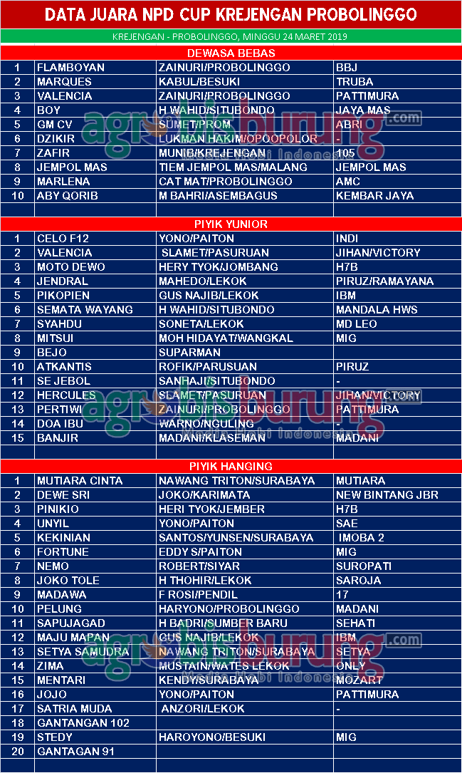 Pertarungan sengit juga tampak di kelas piyik hanging, Mutiata Cinta milik Nawan Triton yang sengaja meluncur ke Probolinggo memang mampu mengoptimalkan kemampuannya. Mutiara Cinta tampil istimewa sehingga Dewi Sri dan Pinokio hanya mampu bertengger diposisi kedua dan ketiga.
