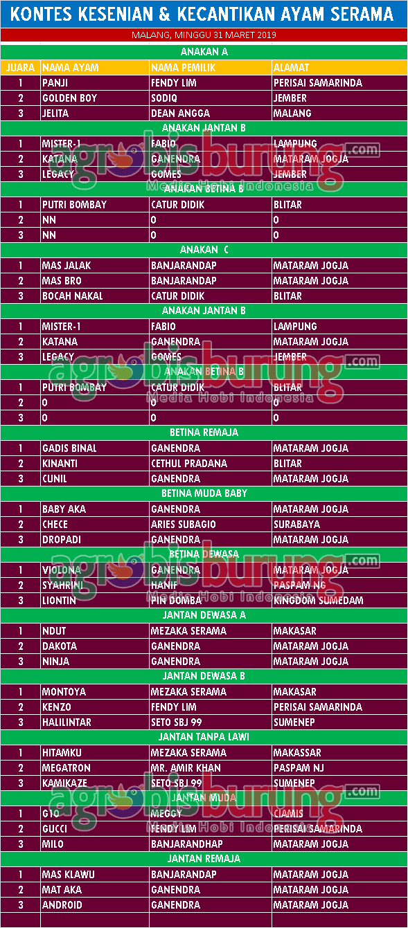 Agenda Ayam Ayam Ayam Headline Hobi Burung Juara Organizer Profil Tokoh Data Juara kontes ayam serama AHMR Cup Malang & Klasemen LSI agrobisburung 6 April 2019 BOTB, BOC, BOF dan Best Fighter BOTB, BOC, BOF dan Best Fighter Tinggalkan Komentar Post navigation Previous: Diserbu Komunitas, Latber Rabu Merah Merona sajikan gelarn plus plus di Mahkota Raja feat GMC SidoarjoNext: Hitamku Kembali Ke Jalur Juara, Iwan Ganendra Pimpin Klasemen Sementara Liga Serama Indonesia 3 More Stories Headline Perkutut Profil Nunu Depok “Turun Gunung” Langsung Borong 5 Pasang K-Unggulan WAT BF Tasikmalaya, H. Pendi Nadira Jakarta Jebol K-WAT Brahmana & BDB BF Lombok Jebol K-WAT Raja Ampat agrobisburung 13 Januari 2026 Headline Juara Perkutut Jawara Bandar Jawa 1, Boxer & Joko Tarub Melejit ke Podium Utama Di Latihan Dinilai Pengcam Pengantenan Pamekasan agrobisburung 12 Januari 2026 Headline Juara Perkutut Jawara Gading Asmara & Cah Samin Berkuasa Dikelasnya di Latihan Dinila Pengda Bojonegoro agrobisburung 11 Januari 2026