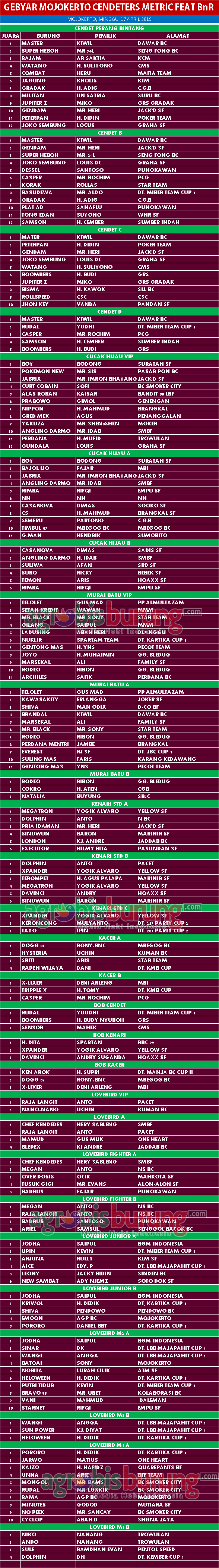 Atas breafing yang diberikan Mr. Afif dan komitmen seluruh panitia dan juri, GMC pun berjalan penuh kesan. Tak pelak lagi, 808 peserta tercatat dalam 28 kelas lomba dan 3 kelas BOB pada lomba yang digelar Minggu (7 April 2019) digantangan Metric BC, di Desa Sambiroto Kecamatan Sooko Kabupaten Mojokerto itu. Khusus cendet, dari 4 kelas lomba dan 1 kelas cendet BOB, tercatat sebanyak 214 peserta yang bertarung ketat.