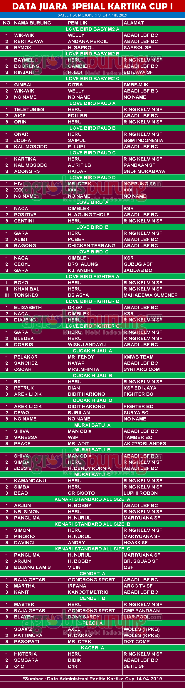 “Saya hanya bisa mengucapkan terima kasih setinggi-tingginya atas kepedulian dan kebersamaan yang ditunjukkan para kicau mania yang hadir. Disamping itu, saya atas nama pribadi maupun panitia Kartika Cup, mohon maaf bila masih banyak kekurangan dan pelayanan yang belum memuaskan,” ujarnya sembari menyatakan bila kelak di event selanjutnya akan lakukan pembenahan agar bisa memberikan yang terbaik buat seluruh kicau mania nusantara ini. AB-USE