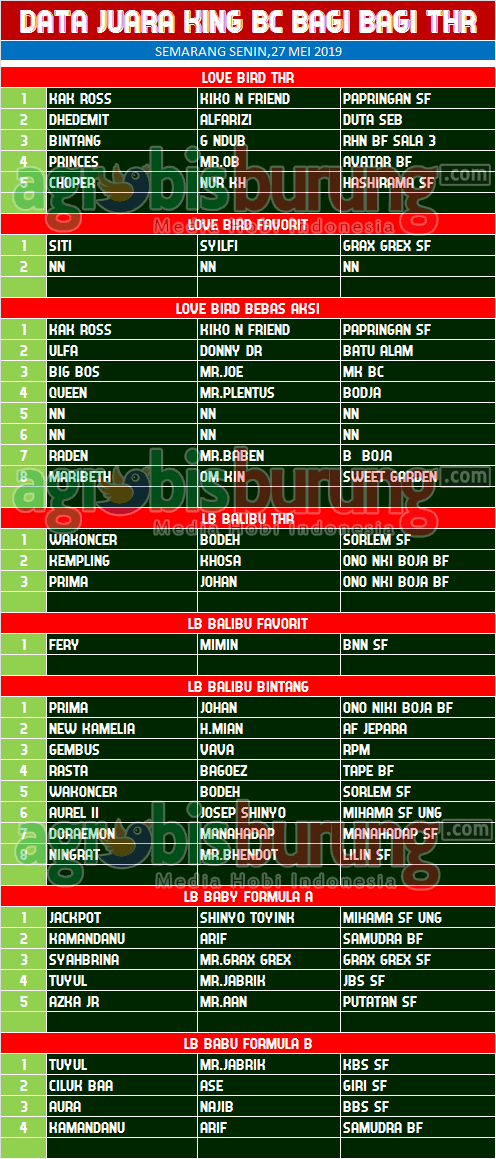 Data Juara Kicauan King BC Bagi Bagi THR Di Semarang, Senin 27 Mei
