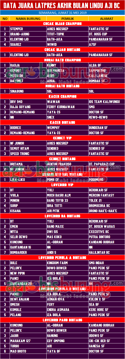 Headline Hobi Burung Juara Kicauan Kicauan Organizer Profil Data Juara Kicauan Latpres Akhir Bulan Lindu Aji BC Semarang, Jumat 31 Mei agrobisburung 1 Juni 2019 Data Juara Kicauan Latpres Akhir Bulan Lindu Aji BC Semarang, Jumat 31 Mei Tinggalkan Komentar Post navigation Previous: Data Juara Kicauan Latpres Ramadhan & final liga Camport di Gantangan RKN SidoarjoNext: Fantastis SF borong juara, BRV940 & Radja juarai kelas Champion di latpres bagi bagi THR Lindu Aji BC Semarang More Stories Headline Perkutut Profil Pramando Jakarta Penghobi Pemula Pemberani, Siapkan Amunisi Lomba dengan Memborong Produk Terkini WAT BF Tasikmalaya Plus Booking Kandang WAT Slipknot & WAT Revolusi agrobisburung 20 November 2025 Headline Juara Perkutut Tetap Semangat Ke Lapangan, Jawara Champion & Galih Jati Bikin Kejutan Di Latihan Dinilai Rabuan Marina Semarang agrobisburung 20 November 2025 Headline Hobi Lain Perkutut Profil Jawara Ruby Star Ikon Prima Rasa Team Bandung, Selama 2,5 Tahun Eksis di Papan Atas & Sudah Menjajal Semua Gelaran Lintas Blok agrobisburung 19 November 2025