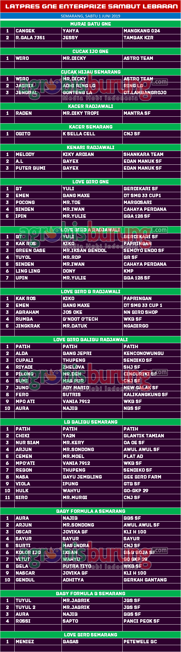 Agenda Headline Hobi Burung Juara Kicauan Kicauan Kicauan Data Juara GNE Enterprize Sambut Lebaran di Semarang agrobisburung 3 Juni 2019 Tinggalkan Komentar Post navigation Previous: Gendeng BC – Markas Klewer SF Juara Umum, Murai Batu BB King Come Back Sekaligus Penutup Liga Camport Gantangan RKN SidoarjoNext: MB Kapal Keruk Jagoan Roby Doda Pejanten 45 Jakarta Selalu Eksis di Tangga Juara, siap Ngluruk Umi Kalsum II More Stories Headline Perkutut Profil Pramando Jakarta Penghobi Pemula Pemberani, Siapkan Amunisi Lomba dengan Memborong Produk Terkini WAT BF Tasikmalaya Plus Booking Kandang WAT Slipknot & WAT Revolusi agrobisburung 19 November 2025 Headline Hobi Lain Perkutut Profil Jawara Ruby Star Ikon Prima Rasa Team Bandung, Selama 2,5 Tahun Eksis di Papan Atas & Sudah Menjajal Semua Gelaran Lintas Blok agrobisburung 19 November 2025 Headline Juara Perkutut Latihan Dinilai Arisan Kaliwono, Dawuhan Sukowono Jadi Ajang Persiapan lomba, Jawara Suci & Rujak Cingur Tampil Joss agrobisburung 18 November 2025