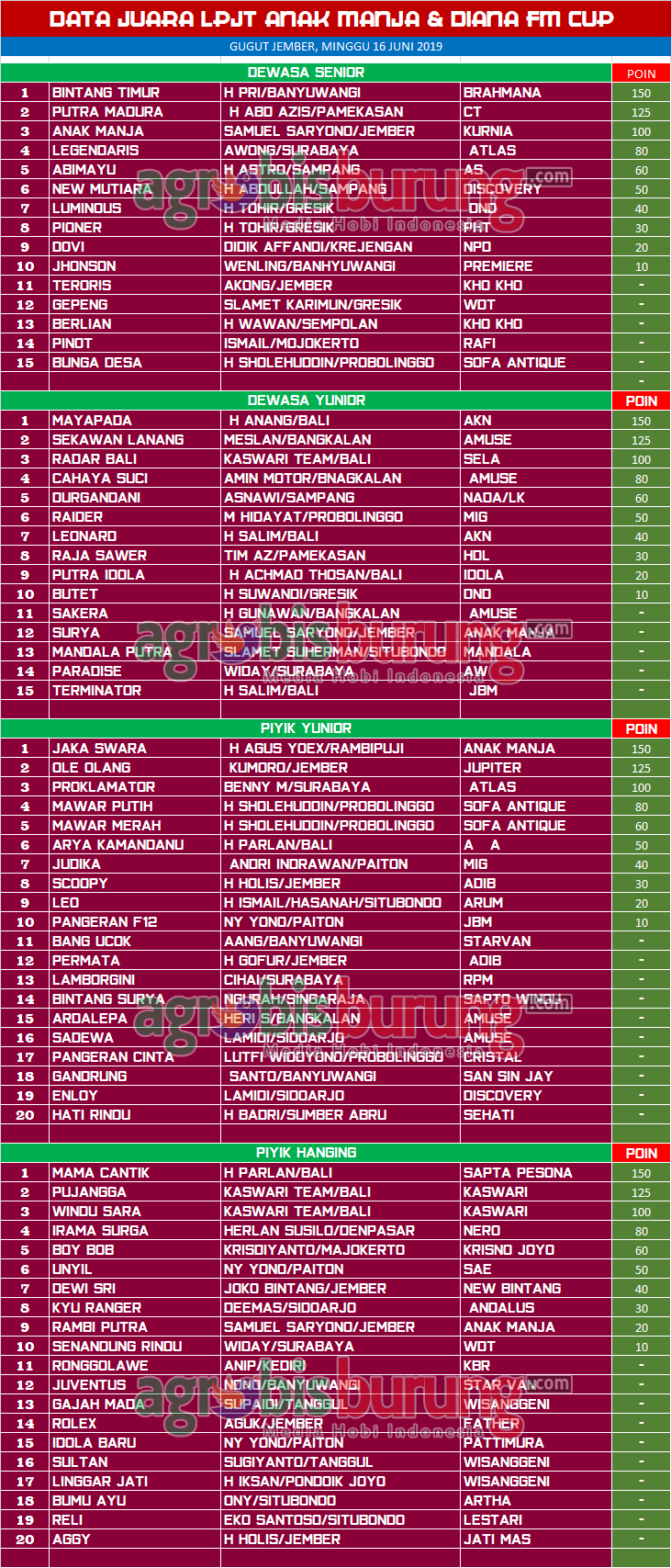 Data Juara Perkutut LPJT Anak Manja & Diana FM Cup di Gugut Jember, Minggu 16 Juni