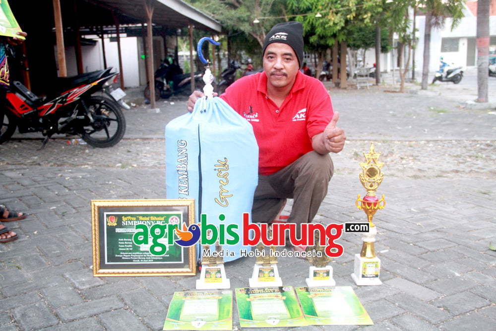 AGROBISBURUNG.COM – GRESIK. Masih dari kawasan Srembi, Gantangan Simphony BC Gresik, Minggu (16/6), tempat dilangsungkannya lomba bertajuk Latpres Halal Bihalal. Di Kelas Lovebird Dewasa, pencetak hattrick, 3 kelas yang disediakan panitia dibabat habis. Waktu itu tampil menggunakan tebok dan kerodong warna merah, banyak yang mengira burung tersebut adalah Cantona Dedi Kidal Soga BC, kerap mendominasi perolehan juara di gantangan seputaran Kota Pudak.