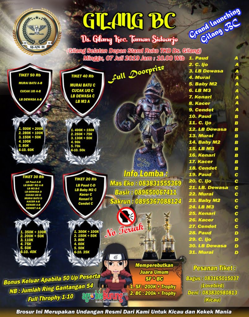 Agenda Headline Hobi Burung Kicauan Kicauan Organizer Profil Grand Laouncing Gilang BC di Taman Sidoarjo, Minggu 07 Juli agrobisburung 27 Juni 2019 AGROBISBURUNG.COM – SIDOARJO. Grand Laouncing Gilang BC di Taman Sidoarjo, Minggu 07 Juli Tinggalkan Komentar Post navigation Previous: Ketua Umum P3SI, Mayjend TN (Purn) H Zainuri Hasyim Take Over produk Halim Bf Bandung, SO’ K-New NapoleonNext: Stop presss …. Road To Anniversary CIG Team Feat P2BG Gresik, Minggu 21 Juli More Stories Headline Organizer Perkutut Hasil Musda Jombang 2026, Agung Hariadi Terpilih Jadi Ketua Baru Pengda Jombang Secara Aklamasi & Siap Lanjutkan Program Ketua Lama agrobisburung 20 Februari 2026 Headline Perkutut Profil WAT BF Tasikmalaya Rilis 69 Kandang Terbaru, “Final Update Season Imlek-Awal Puasa 2026” & Gelar Promo Spesial Selama Sepekan agrobisburung 18 Februari 2026 Headline Perkutut Profil Nurul Dewi Anggun BF Tamberu Sampang Terus berburu Jagoan Lomba & Kembali Taker Over Jawara LPI Diamond (AKS) Dari Masday Dengan Harga Super Fantastik agrobisburung 17 Februari 2026