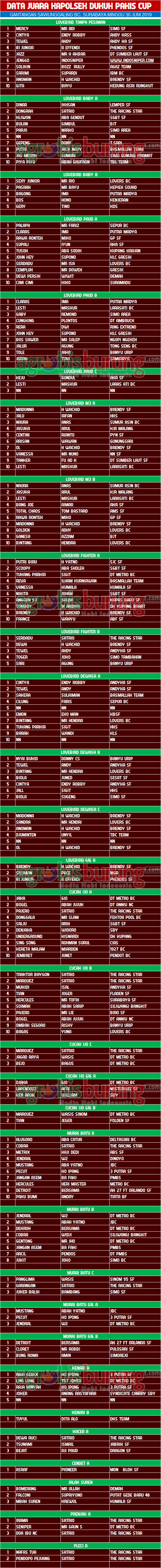 AGROBISBURUNG.COM – SURABAYA. Data Juara Kicauan Kapolsek Dukuh Pakis Cup 2019 di Surabaya, Minggu 30 Juni