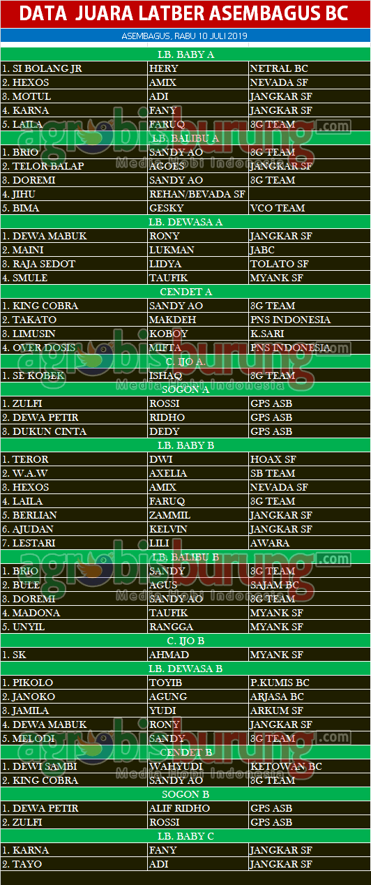 Headline Hobi Burung Juara Kicauan Kicauan Organizer Profil Data Juara Latber Asembagus BC, Rabu 10 Juli agrobisburung 11 Juli 2019 AGROBISBURUNG.COM – ASEMBAGUS. Data Juara Latber Asembagus BC, Rabu 10 Juli Tinggalkan Komentar Post navigation Previous: Data Juara Liga Khusus Hanging Peternak Sampang VI, Kamis 11 JuliNext: Kenari Green Force Nyeri, Kacer Tragedi Stabil, Anis Kembang Asyik Nyaris Genapi Juara Di Lap Ocehan Walikota Cup 2 Surabaya More Stories Headline Hobi Lain Perkutut Profil Siap Terjun Ke LPI 2026, Nurul Anggun Take Over Jawara Muda Hipersonik dari Kurniadi ASM Dengan Deal Fantastik agrobisburung 11 Februari 2026 Headline Juara Perkutut Profil Teamnya Semakin Solid, Jagonya Moncer di LP. Batavia #2 & Breedingnya Sudah Cetak Burung Ciamik agrobisburung 9 Februari 2026 Headline Hobi Lain Juara Perkutut Jawara Mistikus, Kingdom, Saritomo reborn & Bintang Baru Terbaik Utama di LP. #2 Batavia 2026 Bogor agrobisburung 9 Februari 2026