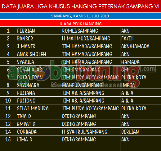 Data Juara Liga Khusus Hanging Peternak Sampang VI, Kamis 11 Juli