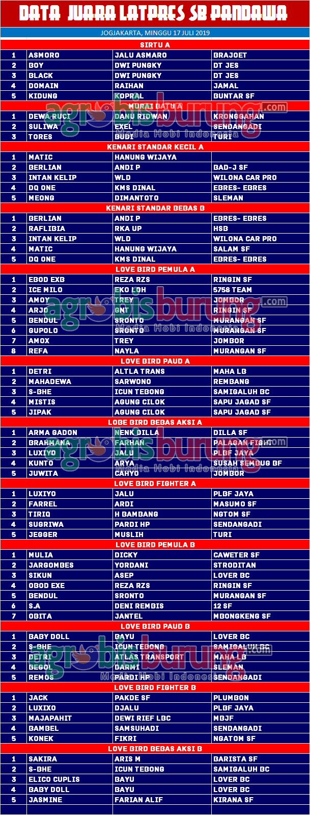 Headline Hobi Burung Juara Kicauan Kicauan Organizer Profil Data Juara Latpres SB Pandawa di Jogja, Minggu 17 Juli agrobisburung 14 Juli 2019 AGROBISBURUNG.COM – JOGJA. Data Juara Latpres SB Pandawa di Jogja, Minggu 17 Juli Tinggalkan Komentar Post navigation Previous: Data Juara Pakualam Cup 2019 di Jogjakarta, Minggu 14 JuliNext: Lomba Burung Piala Cisadane 1 Tangerang, Prepare to Piala Raja 2020, Minggu 28 Juli More Stories Headline Juara Perkutut Jawara Putra Ttasik (Patas), Jengiskhan & Cah Triple Two Melejit Ke Podium Pertama Liga Bumi Roban #1 di Tuban 2026 agrobisburung 26 Januari 2026 Headline Juara Perkutut Pesertanya Luar Biasa di Opening Liga Batavia 2026, Jawara Rodtang, Kingdom, Gas Lee & Bintang Baru Melesat ke Podium Puncak agrobisburung 26 Januari 2026 Headline Juara Perkutut Latihan Dinilai Spesial “Hanging” Disambut Antusiasme Kungmania Priangan Timur, Peresmian Pengurus Baru P3SI Pengda Ciamis-Pangandaran, Putra Wibawa Ngorbit & Sabila Kencana BF Mendominasi agrobisburung 26 Januari 2026