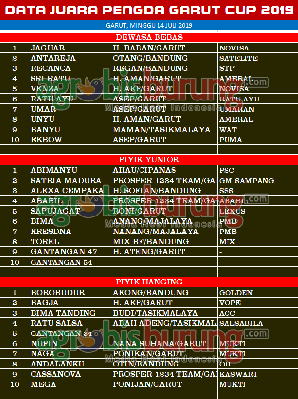 AGROBISBURUNG.COM – GARUT. Data Juara lomba perkutut Pengda Garut Cup, Minggu 14 Juli