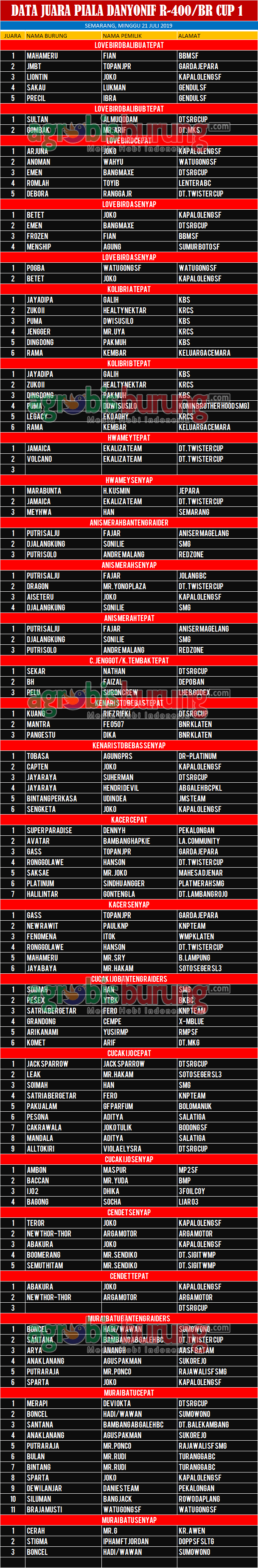 AGROBISBURUNG.COM -SEMARANG. Data Juara Piala DANYONIF R-400/BR Cup 1 di Semarang, Minggu 21 Juli