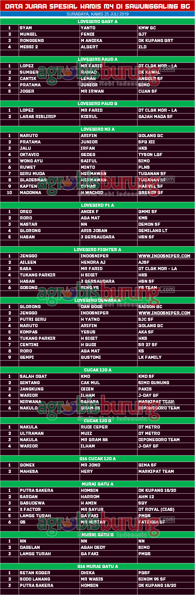Headline Hobi Burung Data Juara Kicauan Spesial Kamis M4 di Sawunggaling BC Surabaya, Kamis 25 Juli agrobisburung 26 Juli 2019 AGROBISBURUNG.COM – SURABAYA. Data Juara Kicauan Spesial Kamis M4 di Sawunggaling BC Surabaya, Kamis 25 Juli Tinggalkan Komentar Post navigation Previous: Jago Jago Terbaik Tim Sumo BF Banjarmasin Moncer di Dua even bersamaanNext: Data juara Kicauan Latpres TRBC di Jogja, Kamis 25 Juli More Stories Headline Perkutut Profil Pramando Jakarta Penghobi Pemula Pemberani, Siapkan Amunisi Lomba dengan Memborong Produk Terkini WAT BF Tasikmalaya Plus Booking Kandang WAT Slipknot & WAT Revolusi agrobisburung 20 November 2025 Headline Juara Perkutut Tetap Semangat Ke Lapangan, Jawara Champion & Galih Jati Bikin Kejutan Di Latihan Dinilai Rabuan Marina Semarang agrobisburung 20 November 2025 Headline Hobi Lain Perkutut Profil Jawara Ruby Star Ikon Prima Rasa Team Bandung, Selama 2,5 Tahun Eksis di Papan Atas & Sudah Menjajal Semua Gelaran Lintas Blok agrobisburung 19 November 2025