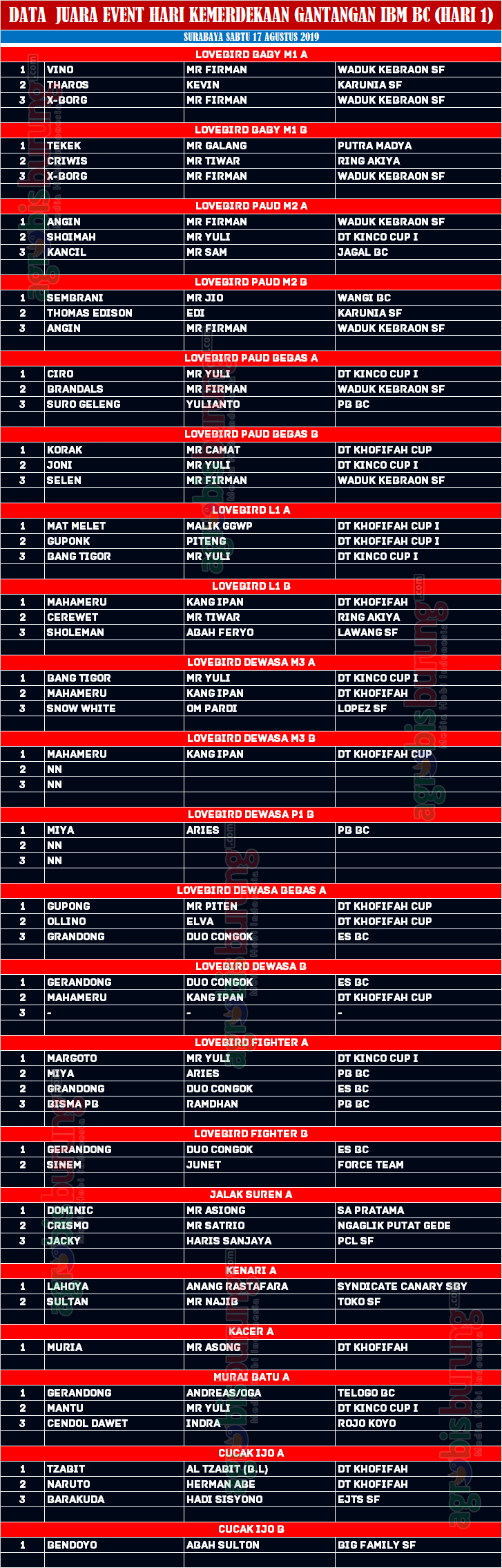 Data Juara Kicauan Event Kemerdekaan Cup di IBM BC Surabaya, Sabtu 17 Agustus