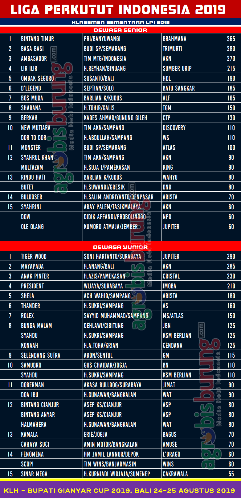 AGROBISBURUNG.COM – BALI. Data Klasemen Sementara Liga Perkutut Indonesia 2019 di LPI Bali – Bupati Gianyar Cup, Sabtu-Minggu 24-25 Agustus
