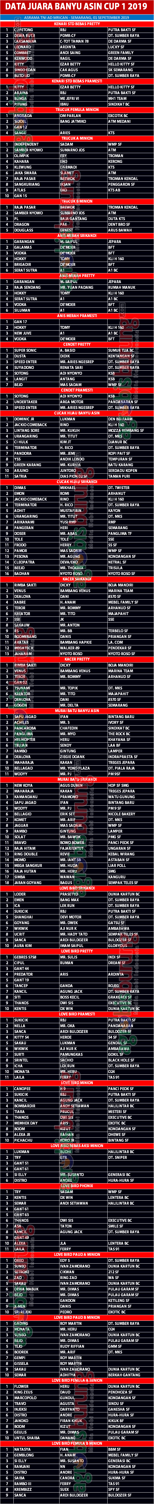 AGROBISBURUNG.COM – SEMARANG. Data Juara Kicauan Banyuasin Cup 1 di Semarang, Minggu 01 September