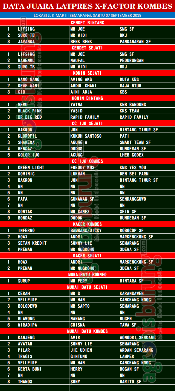 Headline Hobi Burung Juara Kicauan Kicauan Organizer Profil Data Juara Kicauan Latpres X-Factor Kombes Semarang, Sabtu 07 September agrobisburung 8 September 2019 Tony zrondeng (hitam) ketua Kombes AGROBISBURUNG.COM – SEMARANG. Data Juara Kicauan Latpres X-Factor Kombes Semarang, Sabtu 07 September Tony zrondeng (hitam) ketua Kombes Komunitas Konin Tinggalkan Komentar Post navigation Previous: Piala Raja Hamengkubuwono XX 2019 di Alun Alun Selatan Ngayogyakarta Hadiningrat, Sabtu-Minggu 14-15 SeptemberNext: Data Juara Perkutut LPJT Bupati Cup Sampang 2019, Minggu 08 September More Stories Headline Perkutut Profil Pramando Jakarta Penghobi Pemula Pemberani, Siapkan Amunisi Lomba dengan Memborong Produk Terkini WAT BF Tasikmalaya Plus Booking Kandang WAT Slipknot & WAT Revolusi agrobisburung 19 November 2025 Headline Hobi Lain Perkutut Profil Jawara Ruby Star Ikon Prima Rasa Team Bandung, Selama 2,5 Tahun Eksis di Papan Atas & Sudah Menjajal Semua Gelaran Lintas Blok agrobisburung 19 November 2025 Headline Juara Perkutut Latihan Dinilai Arisan Kaliwono, Dawuhan Sukowono Jadi Ajang Persiapan lomba, Jawara Suci & Rujak Cingur Tampil Joss agrobisburung 18 November 2025