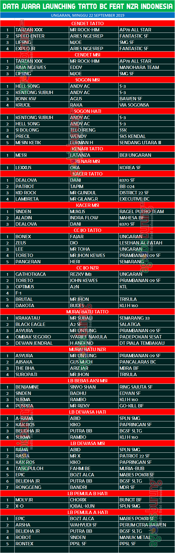 Headline Hobi Burung Juara Kicauan Kicauan Organizer Profil Data Juara Kicauan Lounching Tatto BC Feat NZR Indonesia di Unggaran Semarang, Minggu 22 September agrobisburung 24 September 2019 Tim juri NzR Indonesia AGROBISBURUNG.COM – UNGGARAN. Data Juara Kicauan Lounching Tatto BC Feat NZR Indonesia di Unggaran Semarang, Minggu 22 September Tim juri NzR Indonesia Komunitas Sogon Mas Doni (topi HITAM) pengurus NzR dan Dicko tatto Crew Tatto bc Tinggalkan Komentar Post navigation Previous: Melejit di JHL Arena, Philadelpia Bakal Merepotkan Jago LPI Oktober mendatang & Kamasutra Diboyong Sha Sha DifaNext: Data Juara Kicauan MJA Cup di Jakarta, Minggu 22 September More Stories Headline Perkutut Profil Hendry Sobbandi : “Pemula Perkutut Tak Perlu Bingung dalam Memilih Burung Berkualitas, Fokus Saja pada Karakter Suara !” agrobisburung 27 Februari 2026 Headline Juara Perkutut WAT BF Tasikmalaya “Upgrade” Formasi Kandang Secara Berkala untuk Tingkatkan Kualitas Produksi, Daftar Bookingan Merata & Stok Anakan Selalu “Sold Out” agrobisburung 25 Februari 2026 Headline Organizer Perkutut Hasil Musda Jombang 2026, Agung Hariadi Terpilih Jadi Ketua Baru Pengda Jombang Secara Aklamasi & Siap Lanjutkan Program Ketua Lama agrobisburung 20 Februari 2026