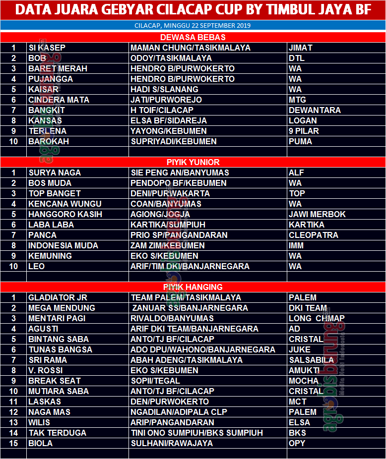 Headline Hobi Burung Juara Organizer Perkutut Perkutut Profil Data Juara Perkutut Gebyar Cilacap Cup By Timbul Jaya BF di Cilacap, Minggu 22 September agrobisburung 24 September 2019 AGROBISBURUNG.COM – CILACAP. Data Juara Perkutut Gebyar Cilacap Cup By Timbul Jaya BF di Cilacap, Minggu 22 September Tinggalkan Komentar Post navigation Previous: Centeng, Renjana & Sapujagad Semakin Matang Peformanya di liga Banjarmasin seri VINext: Si Kasep & Surya Naga Tetap Tangguh, Gladiator Jr Mulai Debutnya di Gebyar Cilacap Cup More Stories Headline Hobi Lain Perkutut Profil Siap Terjun Ke LPI 2026, Nurul Anggun Take Over Jawara Muda Hipersonik dari Kurniadi ASM Dengan Deal Fantastik agrobisburung 11 Februari 2026 Headline Juara Perkutut Profil Teamnya Semakin Solid, Jagonya Moncer di LP. Batavia #2 & Breedingnya Sudah Cetak Burung Ciamik agrobisburung 9 Februari 2026 Headline Hobi Lain Juara Perkutut Jawara Mistikus, Kingdom, Saritomo reborn & Bintang Baru Terbaik Utama di LP. #2 Batavia 2026 Bogor agrobisburung 9 Februari 2026
