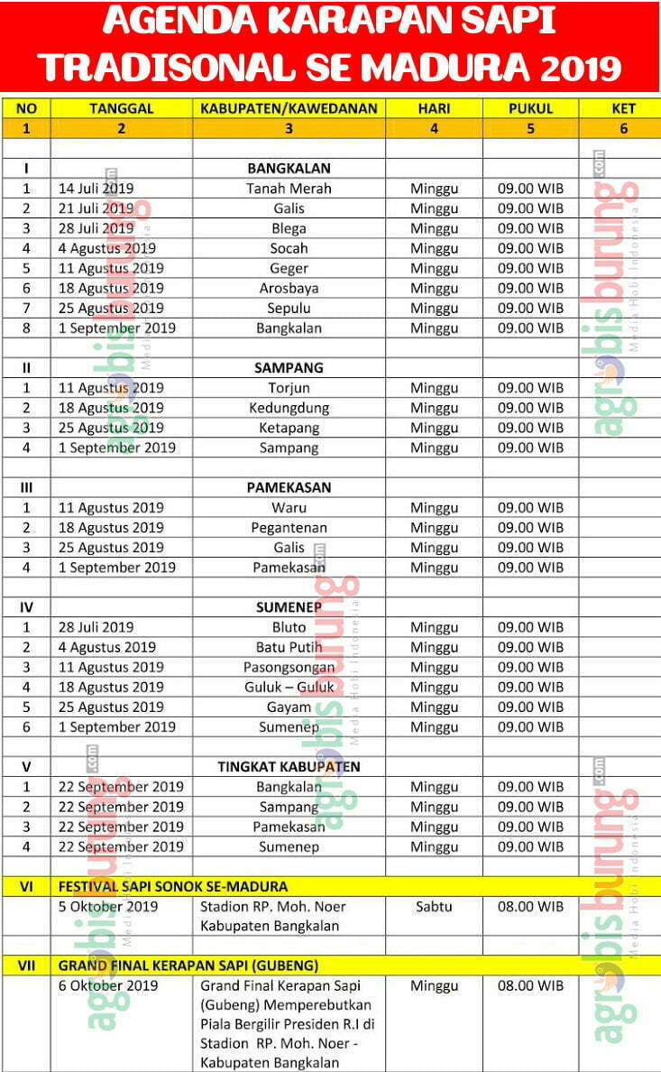 Dan acara lomba Kerapan Sapi yang cukup sangat prestisius di Piala Bergilir Presiden mempertemukan jawara sapi karapan dari 4 Kabupaten yakni Bangkalan, Sampang, Pamekasan dan Sumenep yang berkumpul menjadi satu untuk menjadi yang tercepat di Pulau Madura atau bahkan Dunia. Nah agar para pelancong bisa mengetahui jadwal mainnya, silahkan simak jadwal Karapan Sapi Madura 2019. AB-BER/SUM