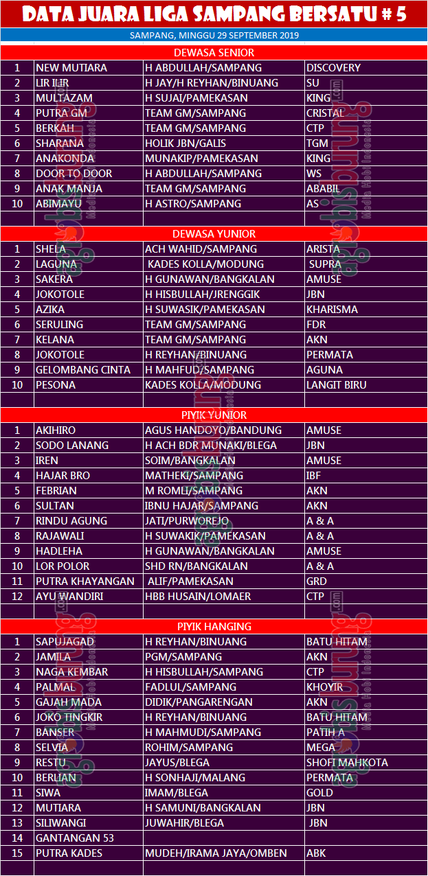 Di kelas piyik hanging, Sapujagad bergelang Batu Hitam milik H Reyhan/H Jay Binuang yang mengeluarkan kehebatannya membuat lawan lawannya rontok satu persatu, Jamila begelang AKN tertahan diperingkat kedua dan Naga Kembar bergelang CTP bertengger diperingkat ketiga dan harus mengakui kehebatan lawannya yang setiap pekan mengunci kemenangan pertama di berbagai lomba di Blok Timur dan lomba beberapa kali konkurs LPI. “Kami atasnama panitia sangat berterima kasih kepada kungmania yang tetap setia hadir di Liga Sampang Bersatu dan sampai bertemu pada seri berikutnya dan seri tersebut bakal seru karena persaingan menduduki peringkat di klasemen sementara Liga Sampang Bersatu mulai ditabuh,” ungkap Ahmad, panitia liga. AB-ADI/end