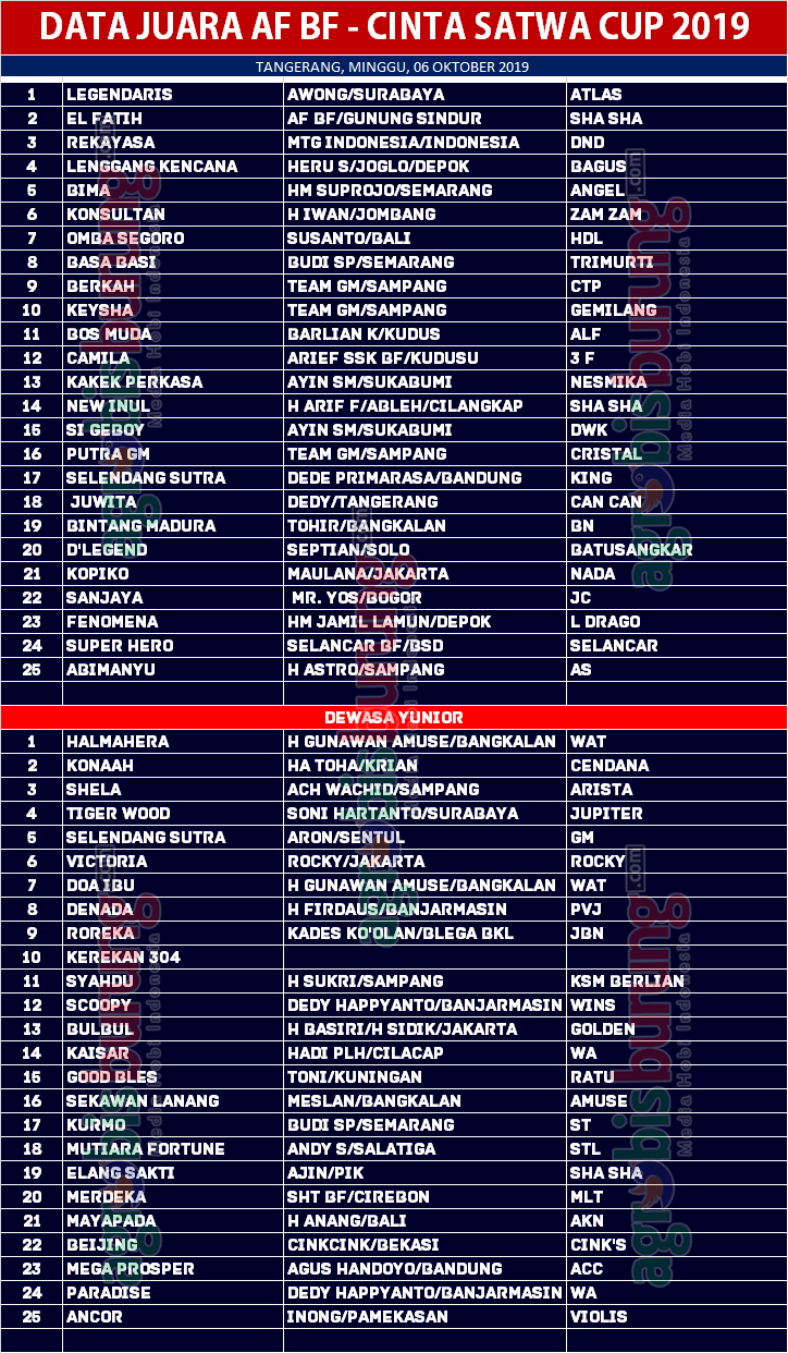 Data Juara Perkutut LPI AF-Cinta Satwa Cup 2019 di JHL Arena Tangerang, Minggu 06 Oktober (Kelas Dewasa)