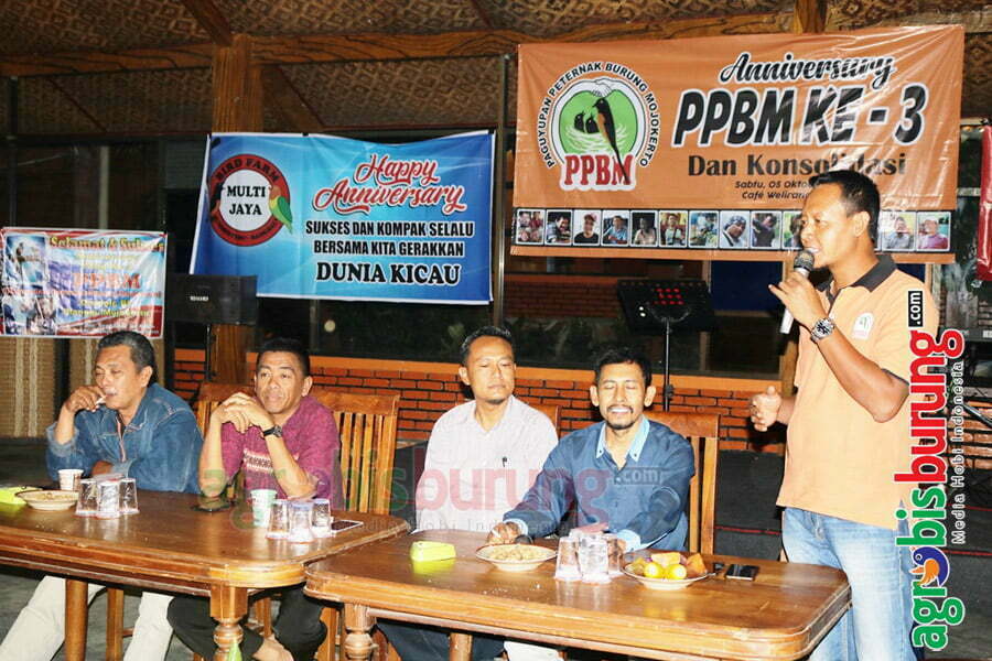 AGROBISBURUNG.COM – MOJOKERTO. Komunitas kicau mania Mojokerto yang tergabung di Paguyuban Peternak Burung Mojokerto (PPBM) terbukti kian peduli. Hal itu dijadikan komitmen bersama, saat menggelar Anniversary PPBM Ke-3 pada Sabtu (5 Oktober 2019) di Cafe Welirang, Kecamatan Pacet, Kabupaten Mojokerto. Acara bertajuk Anniversary PPBM Ke-3 dan Konsolidasi itupun, dihadiri lebih dari 50 penangkar, pengelolah gantangan (EO), dan kicau mania lainnya. Sebelum koordinasi interaktif dimulai, diadakan doa untuk almarhum H. Yusuf sebagai salah satu pendiri PPBM. Doa pun dipimpin H. Qomaruddin atas inisiatif Mr. Buadi, mantan Ketua PPBM periode sebelumnya.