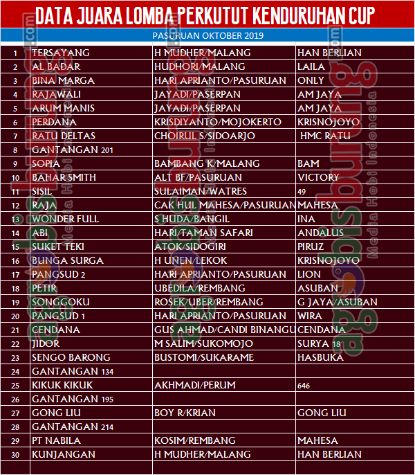 Headline Hobi Burung Juara Organizer Perkutut Perkutut Profil Data Juara Perkutut Kenduruhan Cup 2019 di Pasuruan agrobisburung 12 Oktober 2019 AGROBISBURUNG.COM – PASURUAN. Data Juara Perkutut Kenduruhan Cup 2019 di Pasuruan Tinggalkan Komentar Post navigation Previous: Dipercaya Mr. Tito Dream Sengon, Mr Indra jadi salah satu leader strategi lomba jempolanNext: Ayin Kuasai Dewasa, Anang Tempel ASP, Hartono & Erwin Djaya Berpotensi Susul Bima BF di Klasemen LPJB-Pantura 2019 More Stories Headline Juara Perkutut Jawara Putra Ttasik (Patas), Jengiskhan & Cah Triple Two Melejit Ke Podium Pertama Liga Bumi Roban #1 di Tuban 2026 agrobisburung 26 Januari 2026 Headline Juara Perkutut Pesertanya Luar Biasa di Opening Liga Batavia 2026, Jawara Rodtang, Kingdom, Gas Lee & Bintang Baru Melesat ke Podium Puncak agrobisburung 26 Januari 2026 Headline Juara Perkutut Latihan Dinilai Spesial “Hanging” Disambut Antusiasme Kungmania Priangan Timur, Peresmian Pengurus Baru P3SI Pengda Ciamis-Pangandaran, Putra Wibawa Ngorbit & Sabila Kencana BF Mendominasi agrobisburung 26 Januari 2026