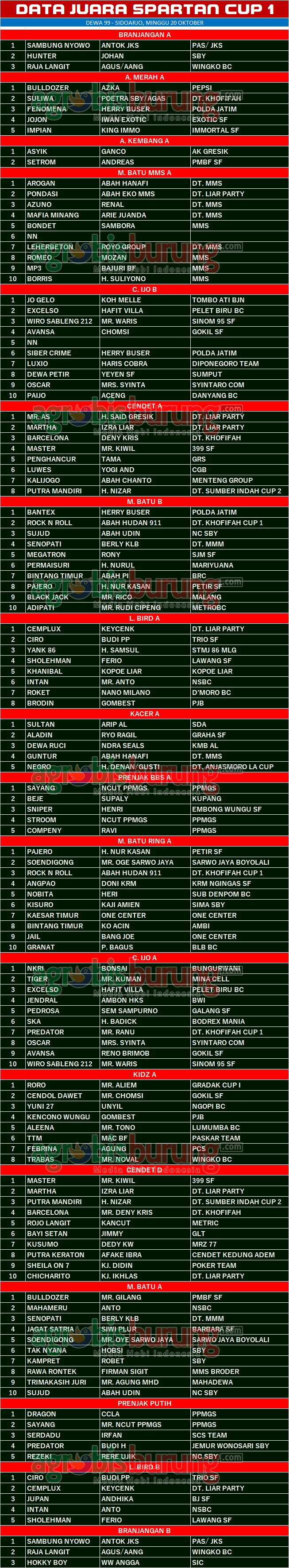 Headline Hobi Burung Juara Kicauan Kicauan Organizer Profil Tokoh Data Juara Spartan Cup 1 di Gantangan Dewa 99 Sidoarjo, Minggu 30 Oktober agrobisburung 22 Oktober 2019 AGROBISBURUNG.COM – SIDOARJO. Data Juara Spartan Cup 1 di Gantangan Dewa 99 Sidoarjo, Minggu 30 Oktober Tinggalkan Komentar Post navigation Previous: CH Gegana, MB Liberty, DJ, KN Kaesang Moncer, Domba Indah Dan Kadal Jaya Juara Umum Di Piala Jamal Mandiri II CirebonNext: Data Juara 2nd Anniversary Krishna BC di Lamongan, Minggu 20 Oktober More Stories Headline Perkutut Profil Pramando Jakarta Penghobi Pemula Pemberani, Siapkan Amunisi Lomba dengan Memborong Produk Terkini WAT BF Tasikmalaya Plus Booking Kandang WAT Slipknot & WAT Revolusi agrobisburung 19 November 2025 Headline Hobi Lain Perkutut Profil Jawara Ruby Star Ikon Prima Rasa Team Bandung, Selama 2,5 Tahun Eksis di Papan Atas & Sudah Menjajal Semua Gelaran Lintas Blok agrobisburung 19 November 2025 Headline Juara Perkutut Latihan Dinilai Arisan Kaliwono, Dawuhan Sukowono Jadi Ajang Persiapan lomba, Jawara Suci & Rujak Cingur Tampil Joss agrobisburung 18 November 2025
