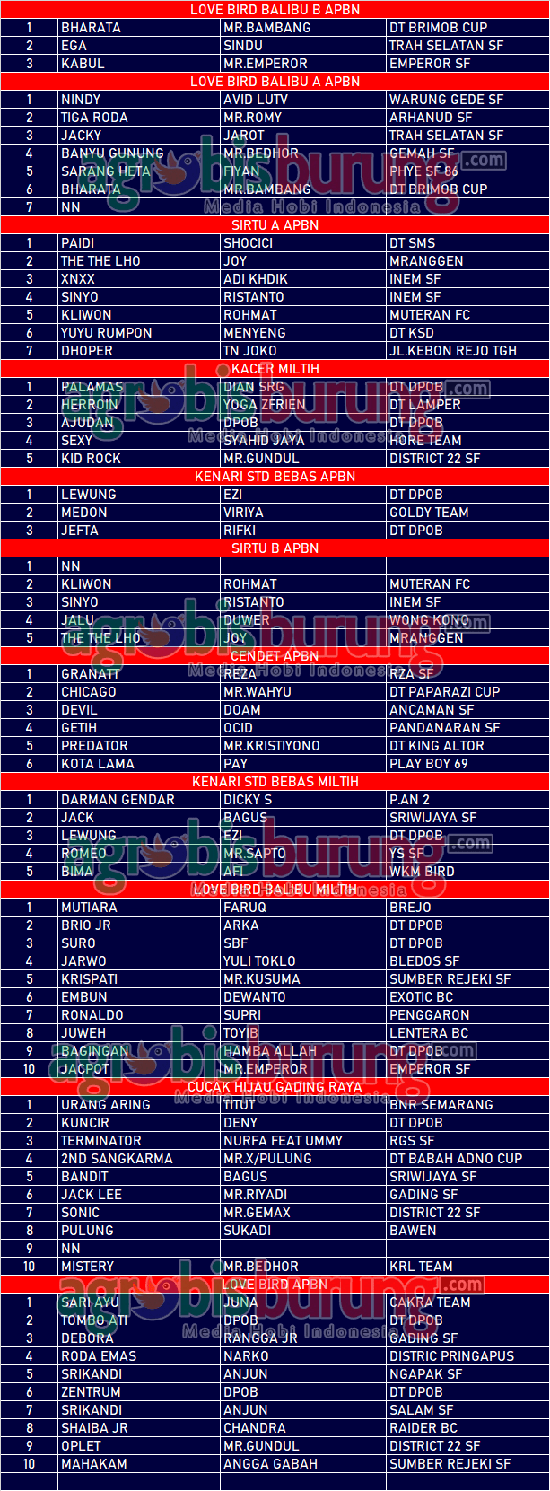 AGROBISBURUNG,COM-SEMARANG. Data juara Kicauan Kapolsek Mrangen Cup Di Semarang, Minggu 20 Oktober