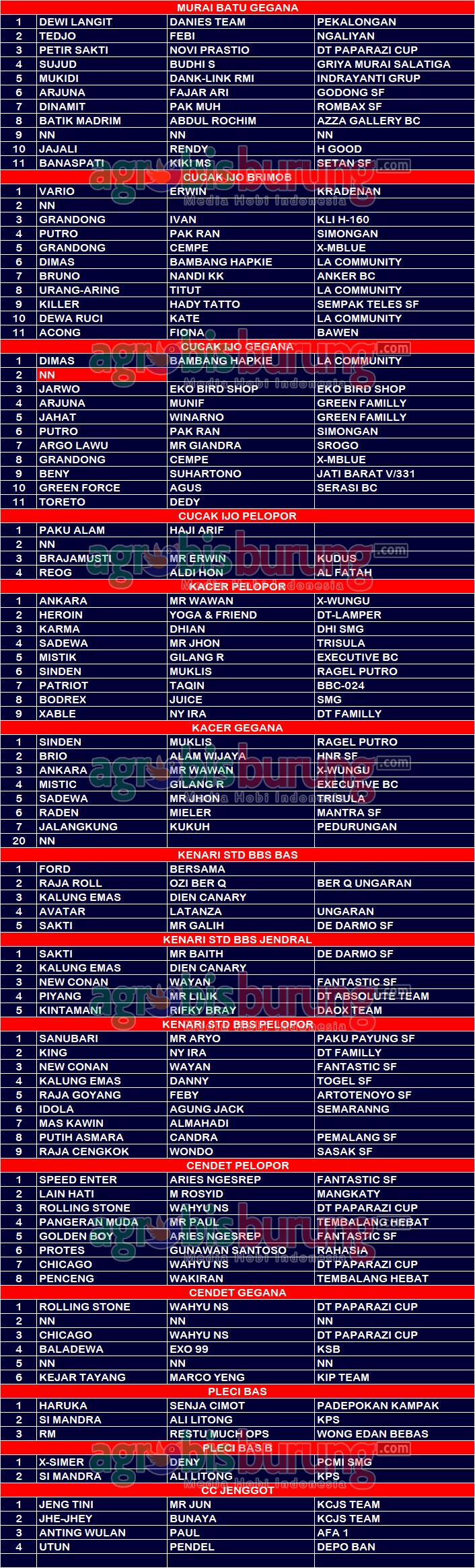 Headline Hobi Burung Juara Kicauan Kicauan Organizer Profil Data Juara Kicauan Brimob Cup 2019 di Semarang, Minggu 27 Oktober agrobisburung 29 Oktober 2019 AKBP Muhammad Ridwan,SIK (tengah) AGROBISBURUNG.COM – SEMARANG. Data Juara Kicauan Brimob Cup 2019 di Semarang, Minggu 27 Oktober Rofiq sangkar Jendral & Nathan Bas AKBP Muhammad Ridwan,SIK (tengah) Tinggalkan Komentar Post navigation Previous: Data Juara Kicauan 1st Anniversary Ngeber SF di Tuban, Minggu 27 OktoberNext: Data Juara Kicauan Piala Gubernur Jatim “Khofifah Cup 1” Di Surabaya, Minggu 27 Oktober 2019 (LAP.B) More Stories Headline Juara Perkutut Pemanasan Jelang Pembukaan LPJB 2026, Unicorn Naik Kelas & Cirebon Trusmi Ngorbit di Liga Kopi Luhur #6 (Penutupan Poin) Cirebon agrobisburung 18 Januari 2026 Headline Hobi Lain Juara Perkutut Jawara Airlanga Moncer Bareng bersama Antsena & Mr M-307 Di Latihan Dinilai Tarkam Galaxy Gresik agrobisburung 18 Januari 2026 Headline Juara Perkutut Jawara Red Bull “Pecah Telor” Empat Warna Di Latihan Dinilai Dewandaru Tulungagung, Jawara Sulur Mas & Deva Alam Moncer di Podium Utama agrobisburung 18 Januari 2026