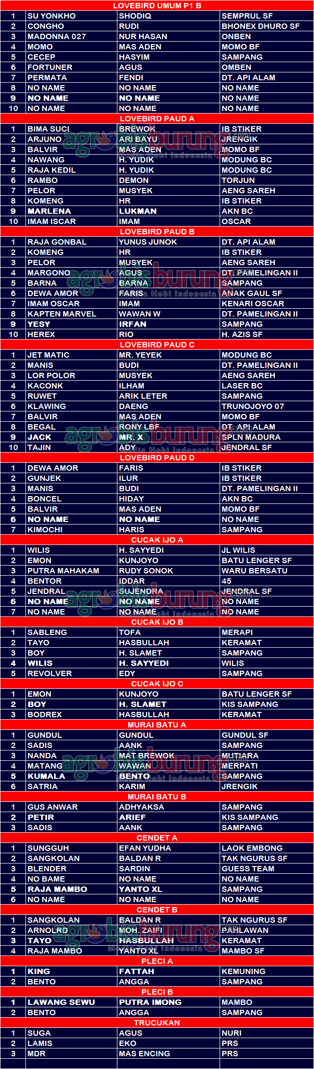 Headline Hobi Burung Juara Kicauan Organizer Perkutut Profil Data Juara Kicauan Anniversary Bat BC Feat BnR Di Sampang, Minggu 27 Oktober agrobisburung 30 Oktober 2019 KRU BAT BC ANNIVERSARY 2019 AGROBISBURUNG.COM – SAMPANG. Data Juara Anniversary Bat BC Feat BnR Di Sampang, Minggu 27 Oktober Tinggalkan Komentar Post navigation Previous: Cucak Ijo Dimas & Vario berbagi juara, Kacer Ankara naik daun di Brimob Cup SemarangNext: Nyaris Tembus 1000 Peserta, LB Kopler Jadi Bintang Setelah Cetak Hatrrick Di Anniversary Bat BF Sampang More Stories Headline Hobi Lain Perkutut Profil Jawara Ruby Star Ikon Prima Rasa Team Bandung, Selama 2,5 Tahun Eksis di Papan Atas & Sudah Menjajal Semua Gelaran Lintas Blok agrobisburung 19 November 2025 Headline Juara Perkutut Latihan Dinilai Arisan Kaliwono, Dawuhan Sukowono Jadi Ajang Persiapan lomba, Jawara Suci & Rujak Cingur Tampil Joss agrobisburung 18 November 2025 Headline Perkutut Profil UKI BF Palu-Sulteng Siap Andalkan Hasil Produk Sendiri, Kakak-Adik Trah Jawara Domisol Moncer: Libanon Stabil & Seruni Terbaik LPJB #9 “Final Point” Majalengka agrobisburung 18 November 2025