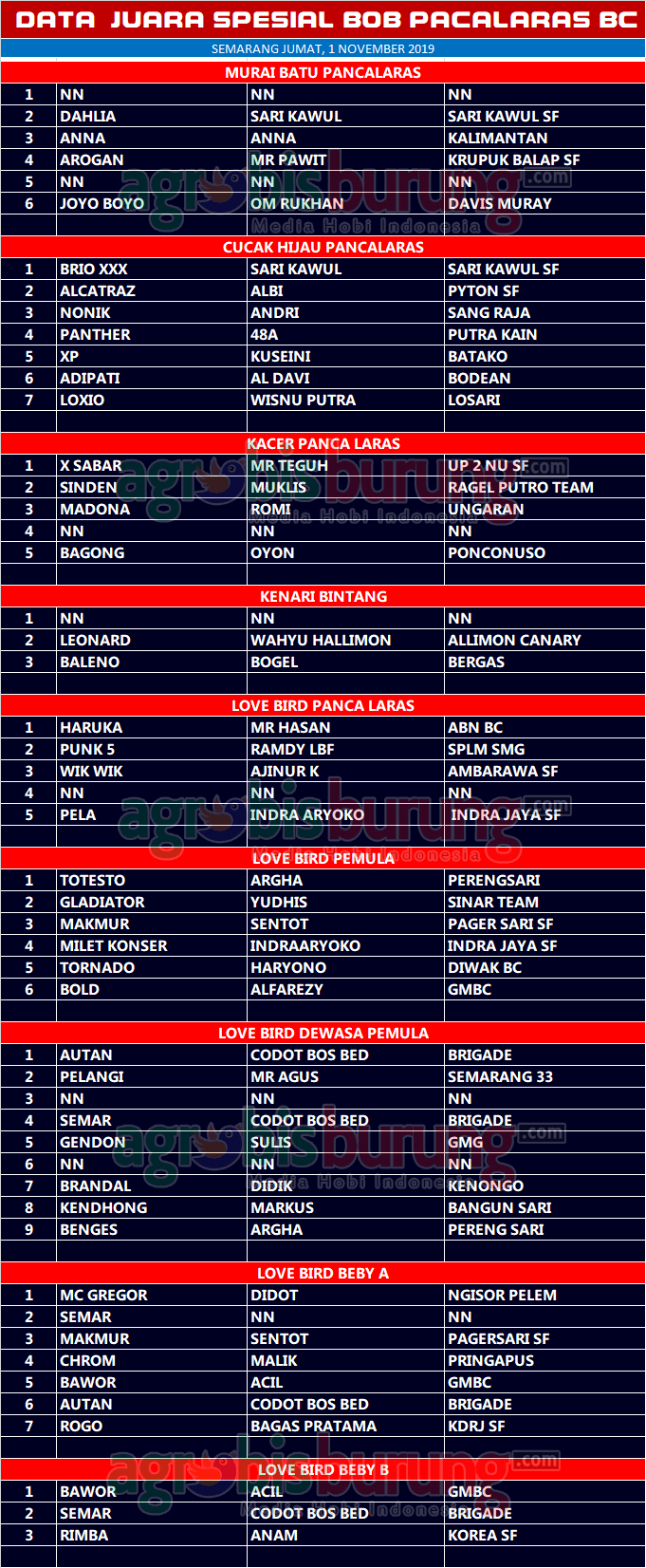AGROBISBURUNG.COM – SEMARANG. Data Juara Kicauan Spesial BOB Pancalaras di Semarang, Jumat 01 November