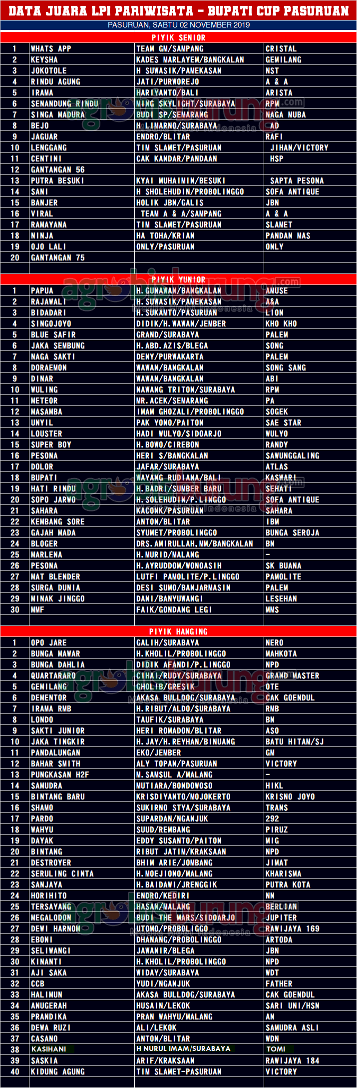 Headline Hobi Burung Juara Organizer Perkutut Perkutut Profil Data Juara LPI Pariwisata – Bupati Cup 2019 di Pasuruan, Sabtu 02 November (Kelas Piyik) agrobisburung 2 November 2019 Mr. Encunk Sampang kemblai jadi bintang di kelas piyik senior AGROBISBURUNG.COM – PASURUAN. Data Juara LPI Pariwisata – Bupati Cup 2019 di Pasuruan, Sabtu 02 November Mr. Encunk Sampang kemblai jadi bintang di kelas piyik senior TONTON VIDEO/VLOG-NYA BY agrobisburung.com Tinggalkan Komentar Post navigation Previous: Data Juara Latber Malam RDS Rajawali Indonesia di Semarang, Jumat 01 NovemberNext: Dewosuto Nyeri, Amunisi Abah Sakri Airlangga Masih Di Jalur Juara, MB Fir’aun – Cucak Ijo Jaguar Nyaris Nyeri Saat Spesial Kamis M4 Sawunggaling BC Surabaya More Stories Headline Juara Perkutut Jawara Putra Ttasik (Patas), Jengiskhan & Cah Triple Two Melejit Ke Podium Pertama Liga Bumi Roban #1 di Tuban 2026 agrobisburung 26 Januari 2026 Headline Juara Perkutut Pesertanya Luar Biasa di Opening Liga Batavia 2026, Jawara Rodtang, Kingdom, Gas Lee & Bintang Baru Melesat ke Podium Puncak agrobisburung 26 Januari 2026 Headline Juara Perkutut Latihan Dinilai Spesial “Hanging” Disambut Antusiasme Kungmania Priangan Timur, Peresmian Pengurus Baru P3SI Pengda Ciamis-Pangandaran, Putra Wibawa Ngorbit & Sabila Kencana BF Mendominasi agrobisburung 26 Januari 2026