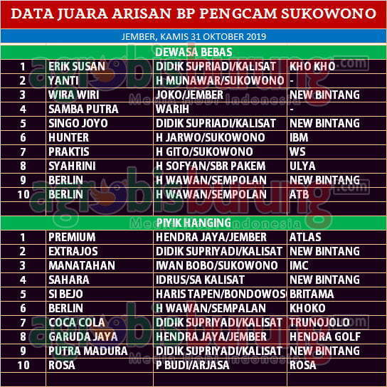 Untuk latber perdana di Sukowono kali ini memainkan dua kelas yaitu dewasa bebas dan piyik hanging, di kelas dewasa bebas Erik Susanjebolan kandang Khoho Jember milik Didik Supriyadi Kalisat melenggang di podium utama setelah melewati pertahanan Yanti milik H Munawar dan Wira Wiri milik Joko yang harus puas di peringkat kedu adan ketiga. Sementara di kelas piyik hanging, debutan gress Premium milik Hendra Jaya bergelang Atlas mampu mengatasi gempuran pesaingnya seperti Extrajos milik Didik Supriyadi dan Manatahan milik Iwan Bobo yang terdepak di posisi kedua dan ketiga.
