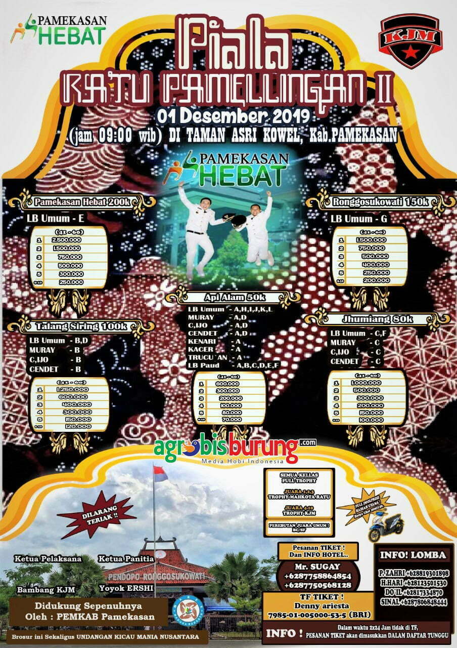 AGROBISBURUNG.COM – GRESIK. Piala Ratu Pamelingan 2 adalah agenda tahunan yang digelar Komunitas Juri Madura (KJM) yang didukung oleh Pemkab. Pamekasan. KJM merupakan EO penjurian asli produk local Madura yang siap bersaing di gelaran-gelaran lomba burung berkicau bertaraf Nasional. “Rencananya gelaran ini akan dibuka oleh Bupati Pamekasan dan trophynya merupakan ciri khas Madura yaitu blangkon Madura, terlihat mewah dan sebagai penghargaan atas kinerja burung Jawara,” tegasnya.
