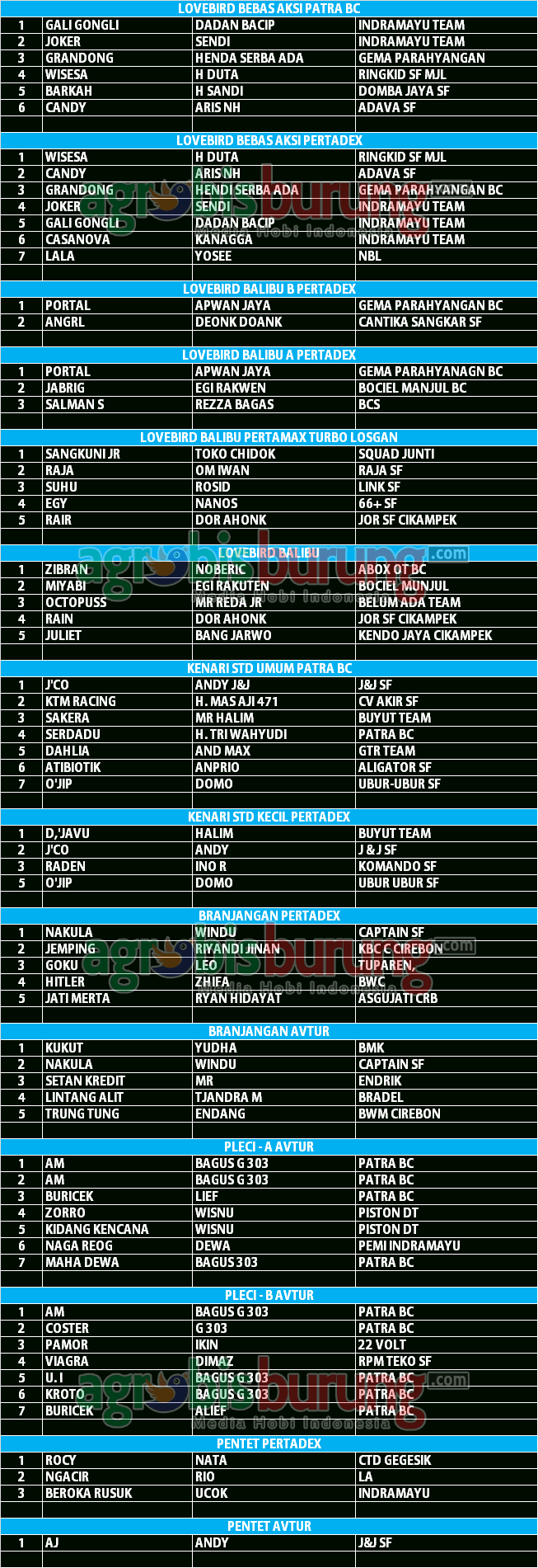 Data Juara Kicauan Piala HUT Pertamina ke-62 di Indramayu, Minggu 08 Desember