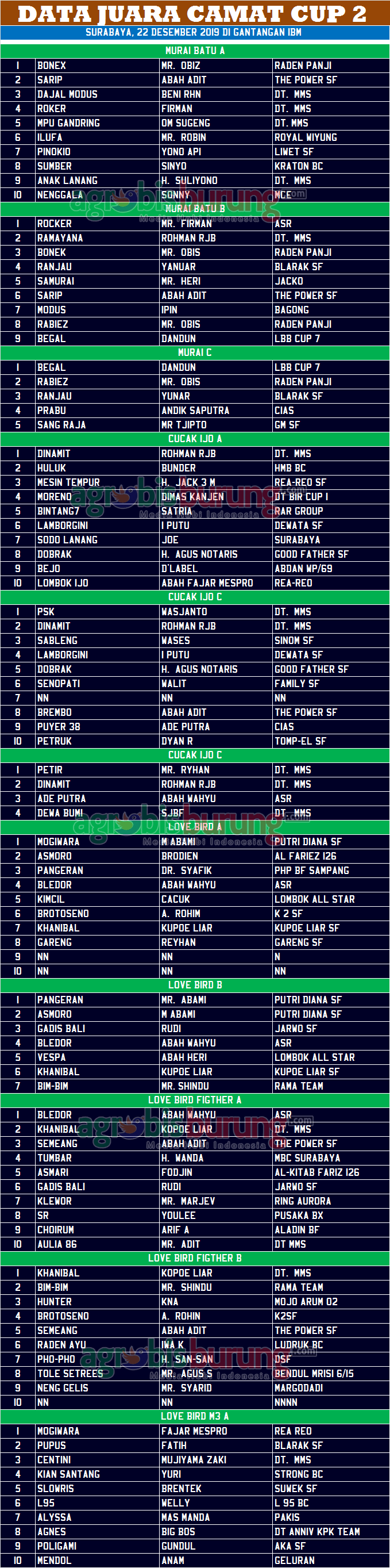 AGROBISBURUNG.COM – SURABAYA. Data Juara Kicauan Camat Cup 2 di Gantangan IBM BC Surabaya, Minggu 22 Desember