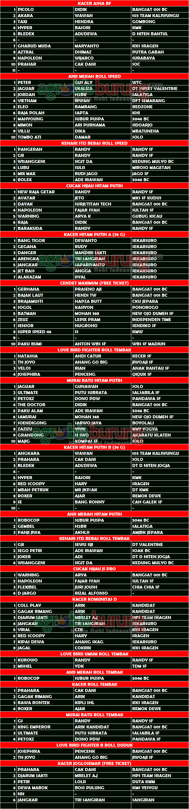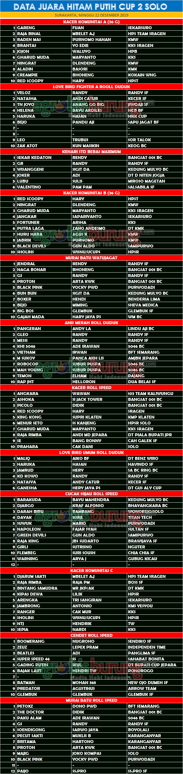 AGROBISBURUNG,COM – SURAKARTA. Data Juara Kicuan Hitam Putih Cup 2 Solo, Minggu 22 Desember