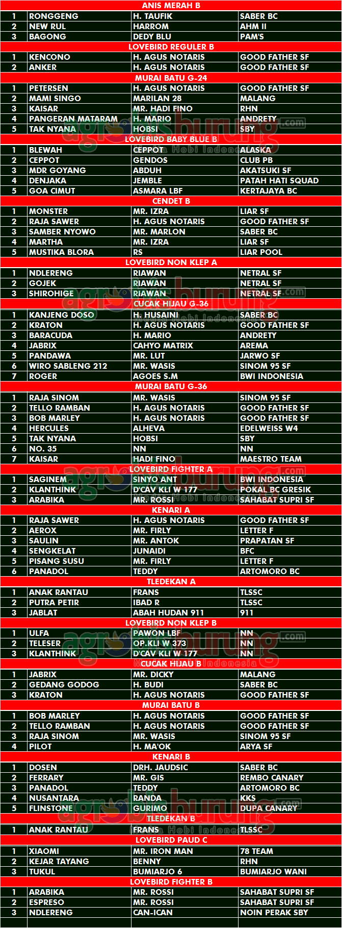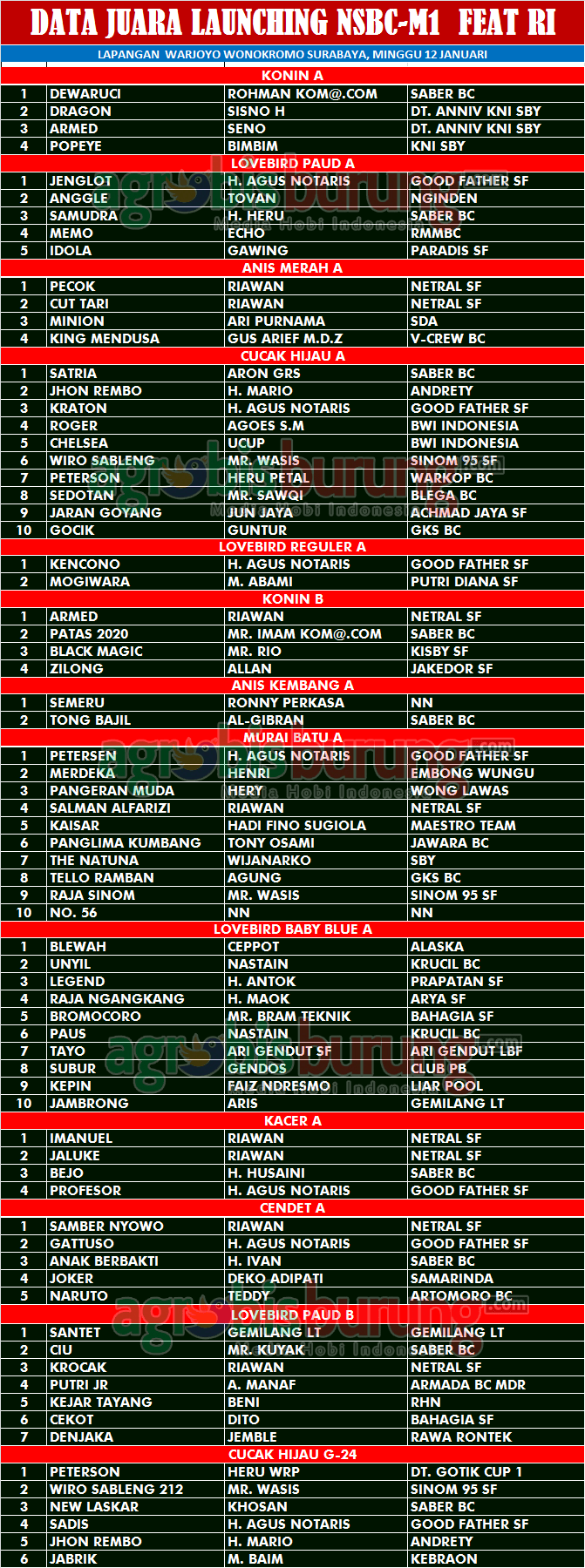 Headline Hobi Burung Juara Kicauan Kicauan Organizer Profil Data Juara Kicauan Lounching NSBC M-1 Feat RI di Surabaya, Minggu 12 Januari agrobisburung 13 Januari 2020 Juara Umum Saber BC AGROBISBURUNG.COM – SURABAYA. Data Juara Kicauan Lounching NSBC M-1 Feat RI di Surabaya, Minggu 12 Januari Juara Umum Saber BC Juara Umum Netral SF Dari Kiri Imron Brekele, Gecol, Abah Robby Nine Star, Ndan Om Benny Ade Laksono CIAS Tinggalkan Komentar Post navigation Previous: Surya Naga Bikin Kejuta, Indo Star & Satria Bermain Menawan di latber Pengda TegalNext: Awal Tahun 2020, King Oliver Naik BC & Puncaki Juara Umum Team di Hello Kitty Bird Contest Jakarta More Stories Headline Juara Perkutut Jawara Rodtang, Raden Segoro & Karebet Meraih Podium Puncak Di Liga Ladini #9 Depok Bersatu 2025 agrobisburung 29 November 2025 Headline Perkutut Profil H Hairul Tiga Bintang Pamekasan Boyong Amunisi Ciamik Dari Ivan BTM Genius Team Dengan Transaksi Super Fantastik agrobisburung 29 November 2025 Headline Perkutut Profil Tambah Amunisi & Trah Ciamik H Iwan TS Jombang Boyong Produk Grand Master Dan LY BF Surabaya agrobisburung 28 November 2025