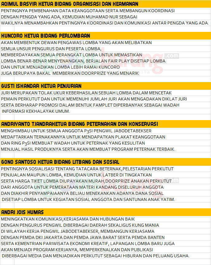 “Ke depannya saya ingin P3SI Pengwil Jabodetabekser terbangun system organisasinya, pembenahan andministrasi SK Pengda serta bidang peternakan harus menjadikan wilayah Jabodetabekser sebagai peternak yang kaya raya. Sebab di Jabodetabekser memilik jumlah peternak yang besar dan ini tugas bidang peternakan dan konservasi. Kita di bidang lomba tetap melajutkan Liga Batavia dan Liga New LPJJB,” jelas H Lilik Hidayatullah.