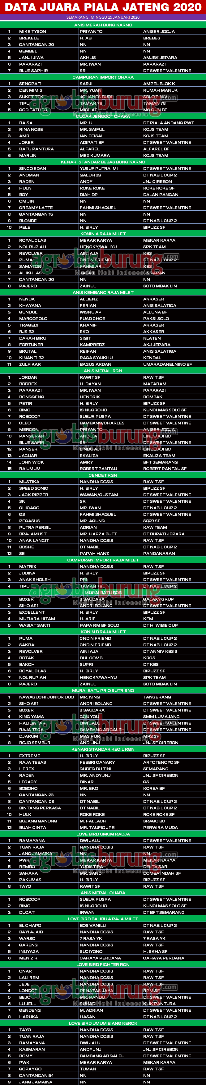 Headline Hobi Burung Juara Kicauan Kicauan Organizer Profil Data Juara Kicauan Piala jateng 2020 di Semarang, Minggu 19 Januari agrobisburung 20 Januari 2020 AGROBISBURUNG.COM – SEMARANG. Data Juara Kicauan Piala jateng 2020 di Semarang, Minggu 19 Januari Tinggalkan Komentar Post navigation Previous: Tutup New LPJJB ’19 di TMII, Kamala & Caca Marica Tampil Energik, Bima Sena & Sasra Bayu MelenggangNext: Data Juara Kicauan Mr Bag 3 di Best Independen Semarang, Minggu 19 Januari More Stories Headline Juara Perkutut Profil Teamnya Semakin Solid, Jagonya Moncer di LP. Batavia #2 & Breedingnya Sudah Cetak Burung Ciamik agrobisburung 9 Februari 2026 Headline Hobi Lain Juara Perkutut Jawara Mistikus, Kingdom, Saritomo reborn & Bintang Baru Terbaik Utama di LP. #2 Batavia 2026 Bogor agrobisburung 9 Februari 2026 Headline Juara Perkutut Dibuka Kapolres , Jawara Red Bull, Super Star & Umar Bin Khatab Melejit Kepuncak Juara Di Gelaran Kapolres Cup Jombang 2026 agrobisburung 8 Februari 2026